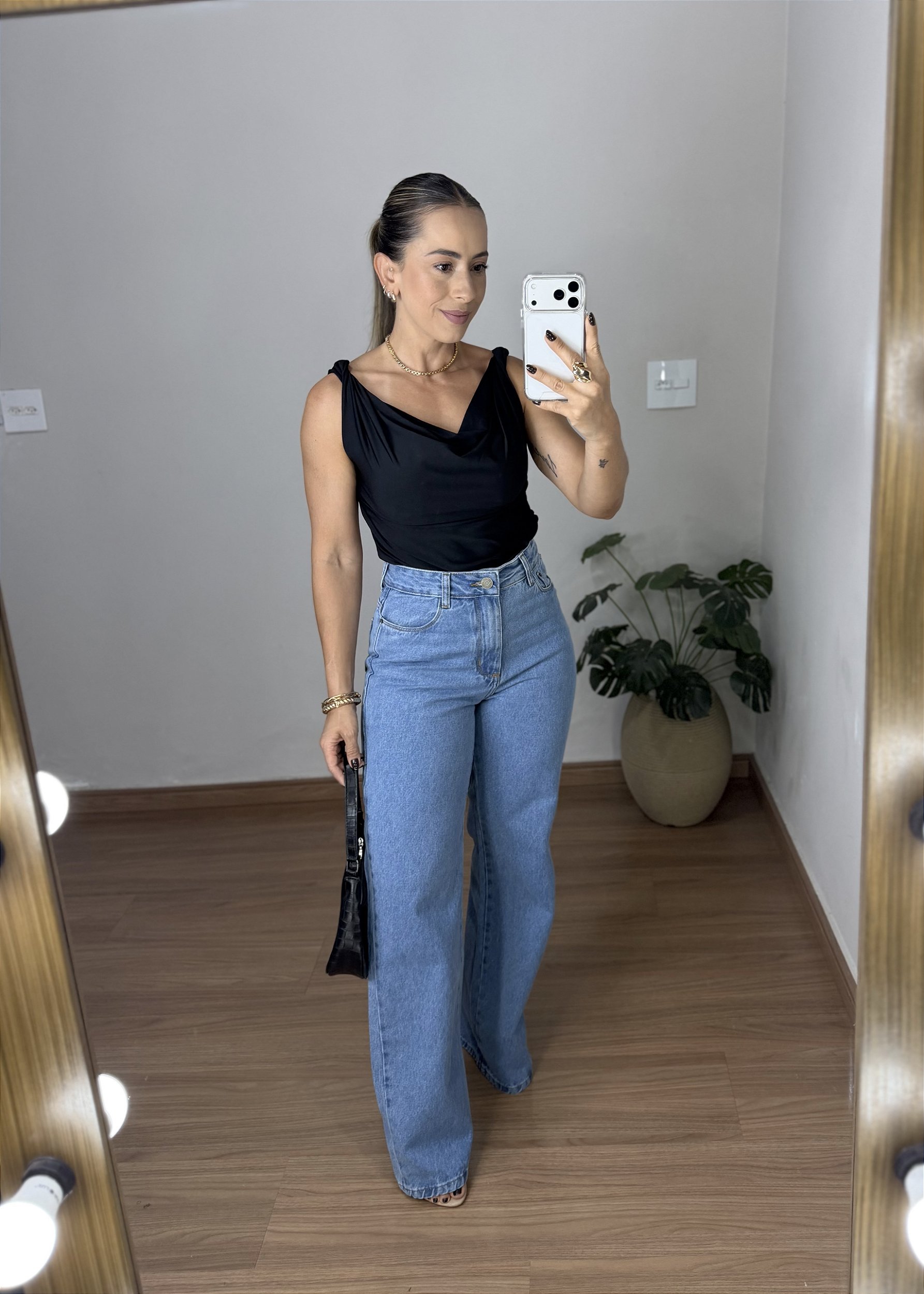 Calça jeans sem elastano. Cos alto. Com fechamento por zíper e botão. Bolsos laterais e no bumbum.