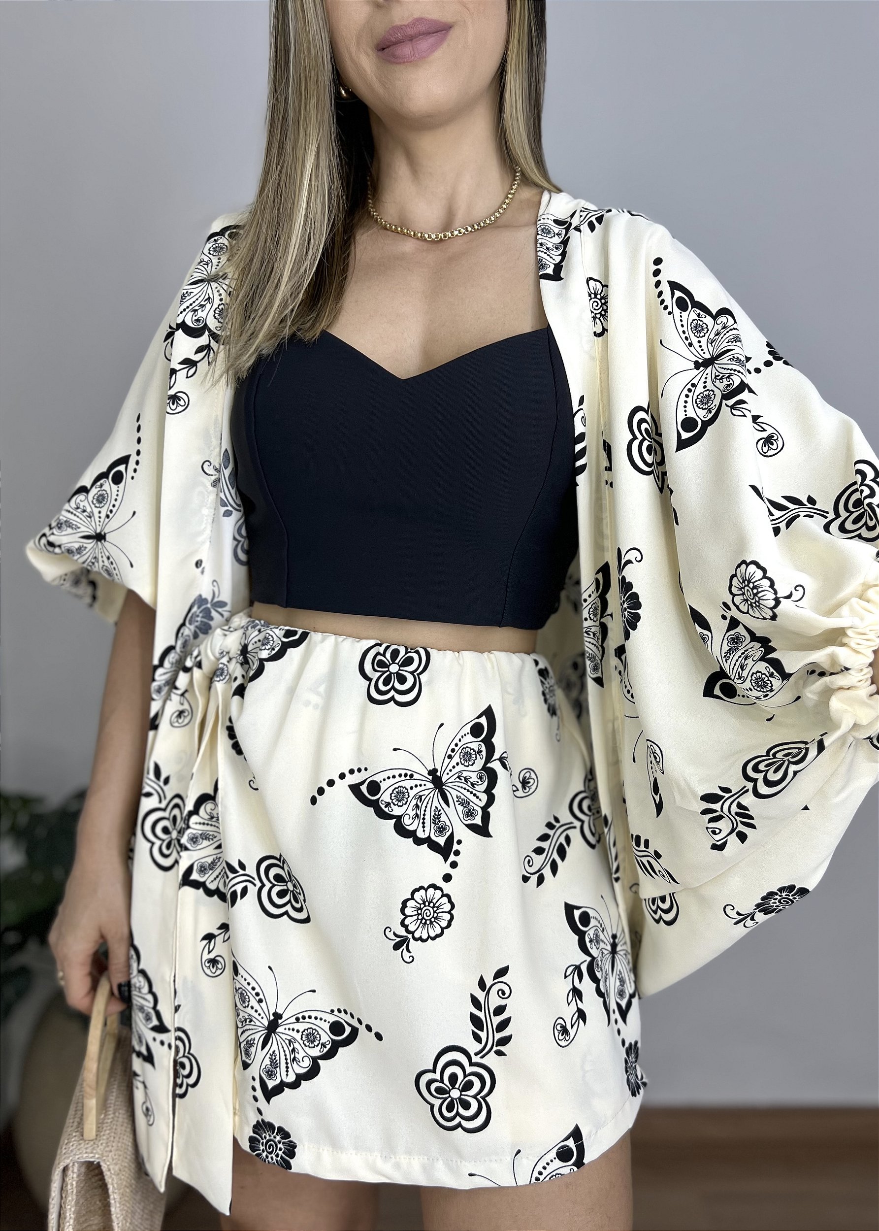 Conjunto composto por kimono com modelagem ampla e manga morcego com elástico no punho, e short saia (short atrás e saia sobreposta na frente, com detalhe que amarra na lateral e elástico nas costas.