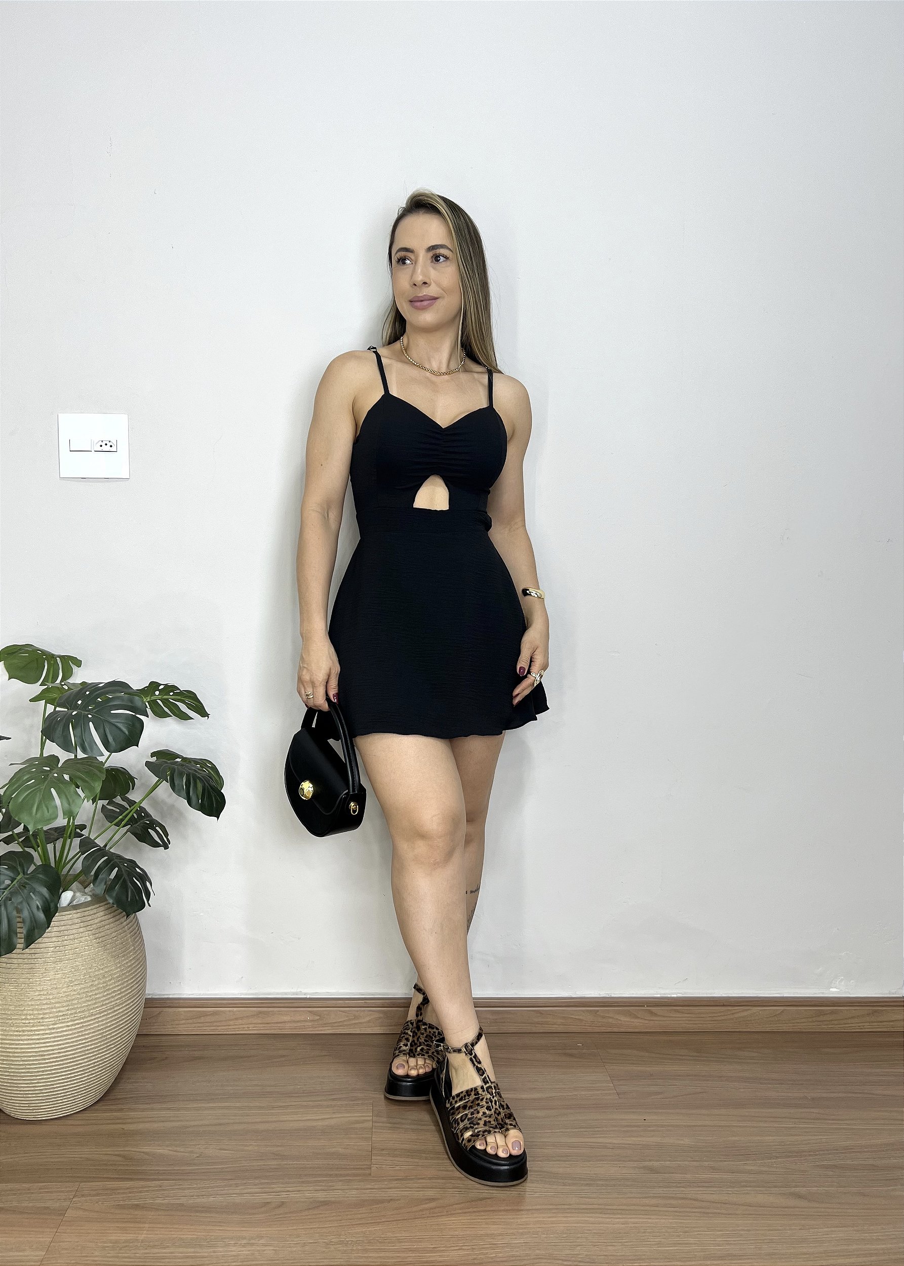 Macacão curto alça reta com regulagem, possui bojo, com decote efeito coração (leve drapeado central), com abertura frontal, possui faixa para ajuste nas costas, elástico na cintura atrás. Short pode dentro e saia por fora