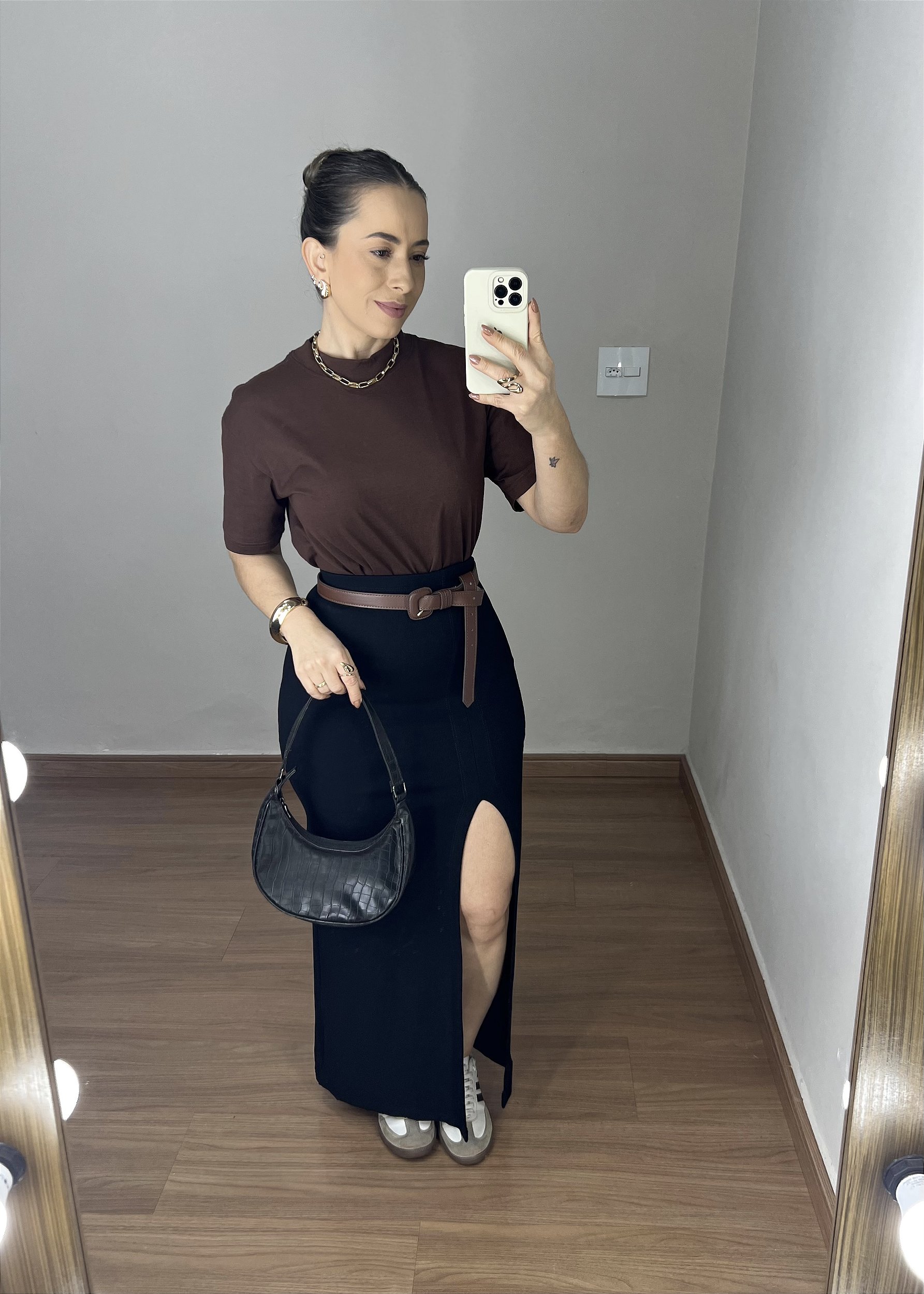 Saia midi com fenda na coxa, possui elastano, cos alto.Teido encorpado que não marca.