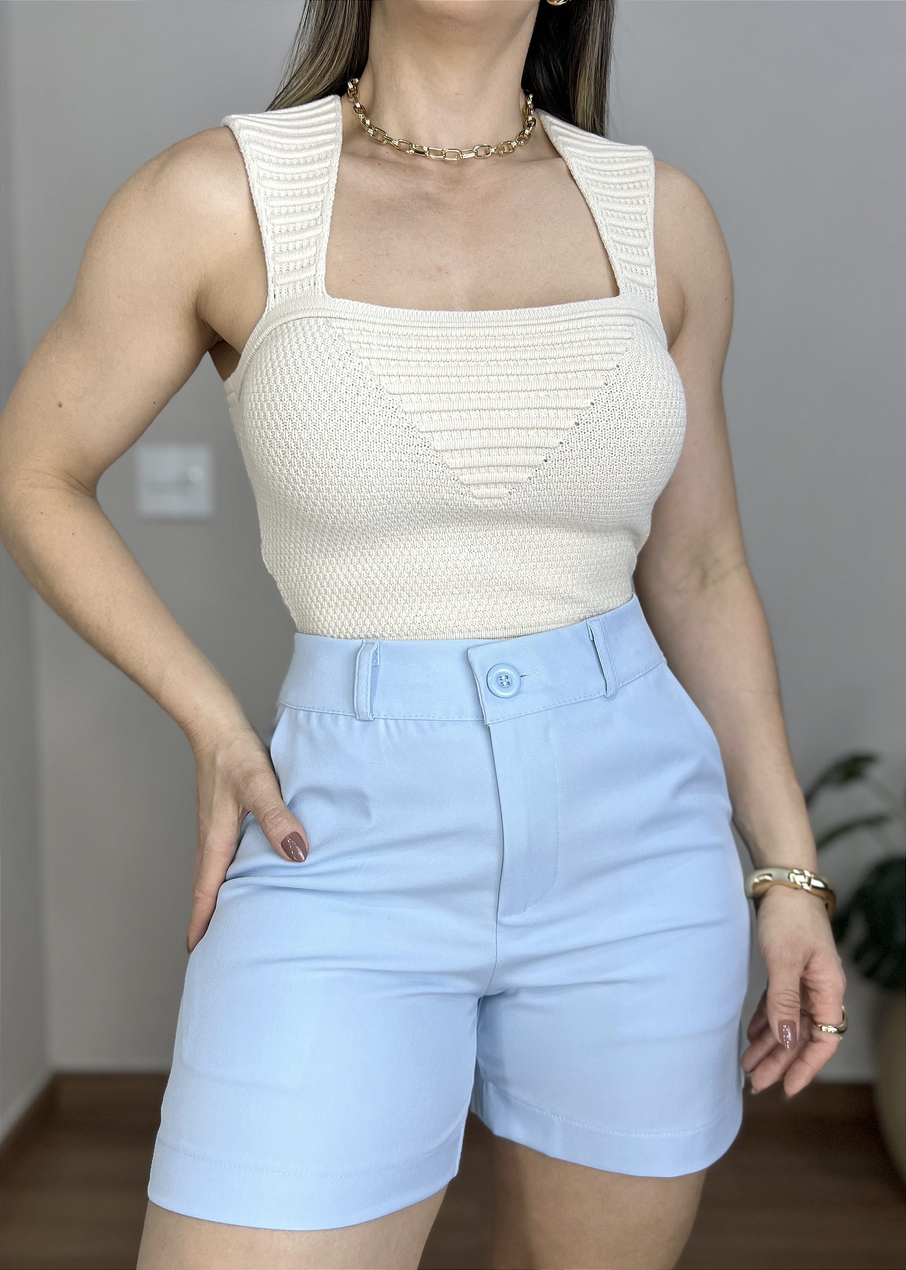 Short alfaiataria, cós alto, com fechamento por botão e zíper, bolsos laterais.
