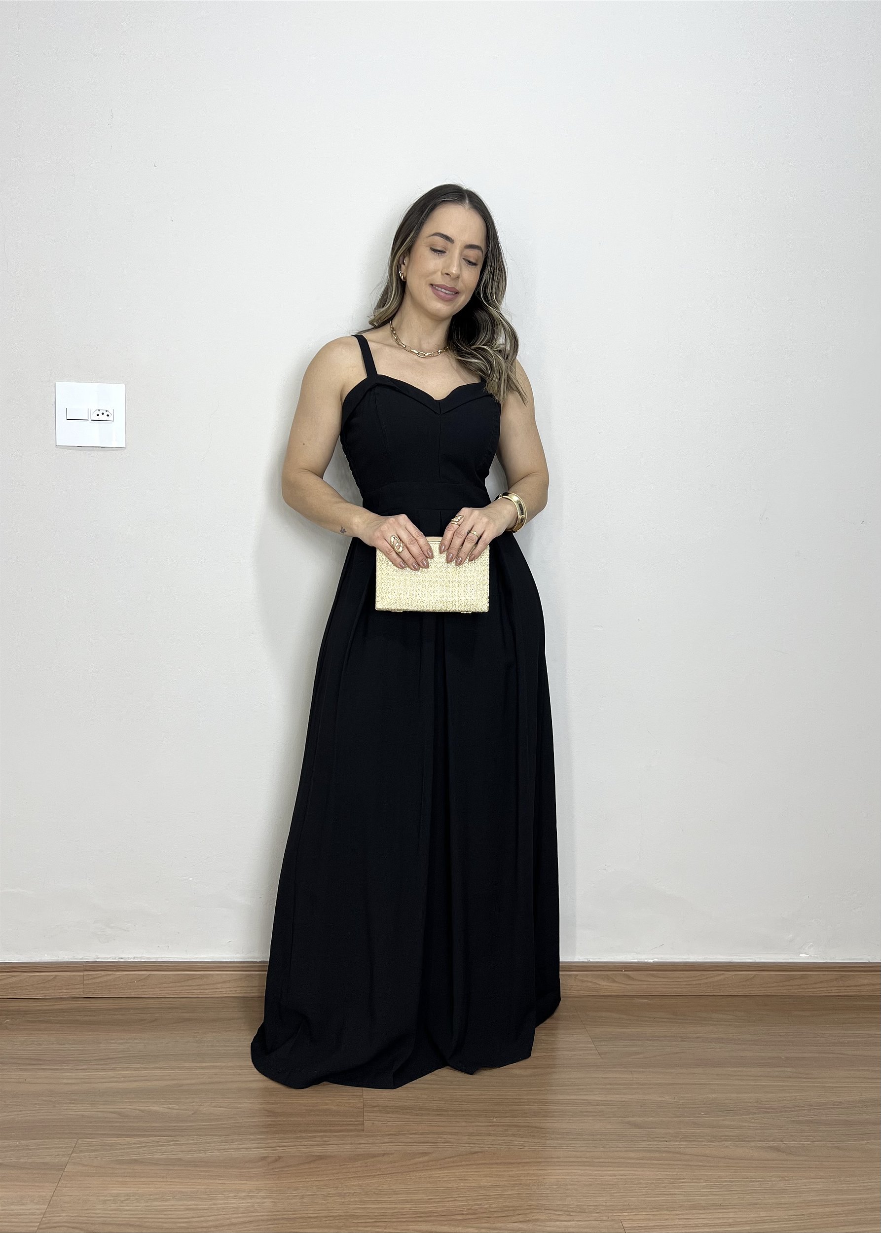 Modelo longo com decote reto em efeito coração.